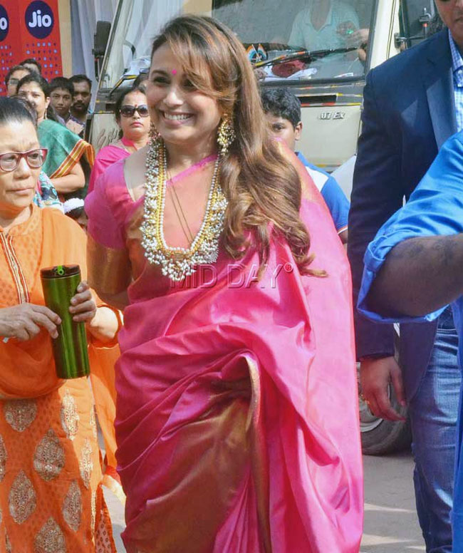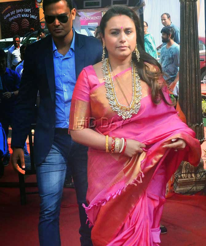 आखिरी बार फिल्म 'मर्दानी' में नजर आईं रानी गुलाबी और गोल्डन बॉर्डर की साड़ी में खूब जंच रही थीं और उस पर उनकी खूबसूरत स्माइल। हालांकि उनका वजन पहले से काफी बढ़ा नजर आ रहा है। इससे पहले वो अपनी बेटी के साथ नजर आई थीं, मगर तस्वीरें बिल्कुल भी साफ नहीं थीं।