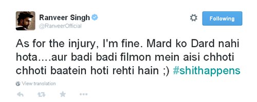 फिल्म के प्रवक्ता ने खबर की पुष्टि करते हुए कहा कि इस हादसे से शूट पर बिलकुल असर नहीं पड़ा है। रणवीर ने भी ट्विटर पर लिखा कि वो ठीक हैं। उन्होंने ट्वीट किया, 'जहां तक चोट का सवाल है, मैं ठीक हूं। मर्द को दर्द नहीं होता और बड़ी बड़ी फिल्मों में ऐसी छोटी-छोटी बातें होती रहती हैं।'
