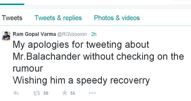 अपनी गलती का अहसास होते ही वर्मा ने तुरंत अपना ट्वीट डिलीट कर दिया लेकिन तब तक काफी देर हो चुकी थी और ये खबर बनकर सुर्खियों में छा गई। इसके बाद वर्मा ने ट्विटर पर माफी मांगी। उन्होंने लिखा, 'अफवाहों की पुष्टि किए बिना बालाचंदर जी के बारे में ट्वीट करने के लिए माफी चाहता हूं। उनकी सेहत में जल्द सुधार की कामना करता हूं।'