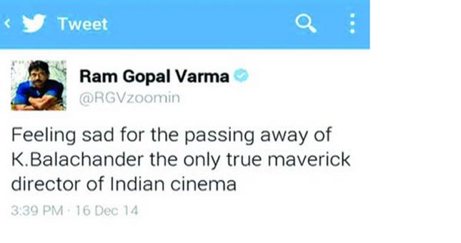 बॉलीवुड फिल्म निर्देशक राम गोपाल वर्मा ने कल साउथ के मशहूर निर्देशक के बालाचंदर के अस्पताल में भर्ती होने की खबर मिलने के बाद ट्विटर पर एक बहुत बड़ी गलती कर दी। वर्मा ने ट्वीट किया, 'के बालाचंदर के निधन की खबर से दुखी हूं। वो भारतीय सिनेमा में अकेले