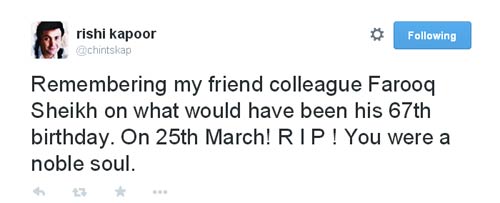 ऋषि ने लिखा, 'अपने दोस्त फारुक शेख को याद कर रहा हूं, अगर वो होते तो इस बार उनके 67वें जन्मदिन पर क्या-क्या होता। उनका जन्मदिन 25 मार्च को है। वो एक पुण्य आत्मा थे। ईश्वर उनको शांति दें।'