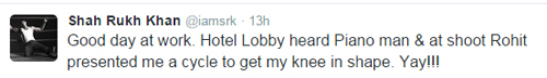 शाहरुख खान ने ट्वीट किया, ‘काम पर आज अच्छा दिन रहा। शूटिंग में रोहित ने मुझे एक साइकिल भेंट की ताकि मेरा घुटना ठीक हो सके।' ये रहा उनका पूरा ट्वीट।