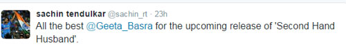 खबर काफी दिलचस्प है। हरभजन सिंह की गर्लफ्रेंड गीता बसरा की नई फिल्म 'सेकेंड हैंड हस्बैंड'' रिलीज होने वाली है और इसके लिए सचिन तेंदुलकर ने उन्हें 'ऑल द बेस्ट' कहा है। उन्होंने ट्वीट कर गीता बसरा को शुभकामनाएं दी हैं।