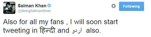 नई दिल्ली। सलमान खान के फैंस के लिए खुशखबरी है। खास तौर से हिंदी और ऊर्दू भाषा बोलने और पसंद करने वालों के लिए, क्योंकि अब वह इन भाषाओं में भी ट्वीट करते नजर आएंगे।