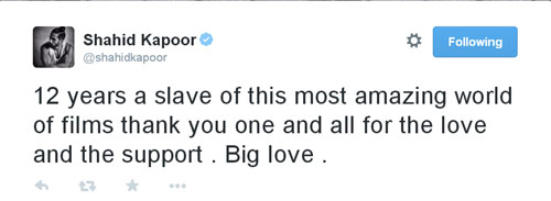 शाहिद ने ट्विटर पर फैंस को उनके प्यार और सपोर्ट के लिए धन्यवाद कहा है। उन्होंने ट्वीट किया, 'फिल्मों की इस शानदार दुनिया का पिछले 12 सालों से गुलाम हूं। सबके प्यार और सपोर्ट के लिए शुक्रिया। बहुत सारा प्यार।'