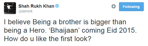 शाहरुख खान ने इसके साथ ट्वीट कर लोगों की इस बारे में राय भी जानने की कोशिश की है। ये रहा उनका ट्वीट, जिसके साथ उन्होंने फिल्म 'बजरंगी भाईजान' में सलमान खान का फर्स्ट लुक पोस्ट किया है। अपने ट्वीट में शाहरुख खान ने लिखा है, 'मेरा मानना है हीरो से ज्यादा बड़ा होता है भाई होना। भाईजान 2015 की ईद पर रिलीज हो रही है। आपको पहला लुक कैसा लगा?'