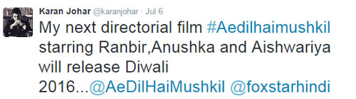 जी हां, फिल्म 'ऐ दिल है मुश्किल' का निर्देशन करने वाले करण जौहर ने भी टि्वटर पर रिलीज डेट की घोषणा कर दी है। इस फिल्म में रणबीर कपूर के अलावा ऐश्वर्या राय और अनुष्का शर्मा भी हैं। ये रहा उनका ट्वीट।