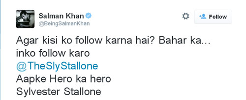 इसके बाद उन्होंने एक और ट्वीट करके फैंस से उन्हें फॉलो करने की गुजारिश की थी। सलमान ने ट्वीट किया था, 'अगर किसी को बाहरी को फॉलो करना है तो सिल्वेस्टर स्टेलोन को फॉलो करो। आपके हीरो का हीरो सिल्वेस्टर स्टेलोन।'