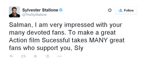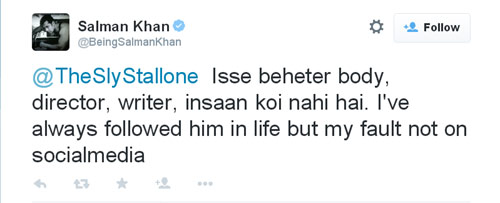 दरअसल हाल ही में सलमान ने ट्विटर पर सिल्वेस्टर की तारीफ करते हुए लिखा था, 'सिल्वेस्टर स्टेलोन से बेहतर बॉडी, निर्देशक, लेखक और इंसान कोई नहीं हो सकता। मैंने अपनी जिंदगी में हमेशा उन्हें फॉलो किया है लेकिन मेरी गलती है कि सोशल मीडिया पर उन्हें फॉलो नहीं किया।'