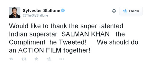 इसके बाद सिल्वेस्टर ने सलमान से उनकी तारीफें करने के लिए शुक्रिया कहा और उन्हें अपने साथ एक एक्शन फिल्म करने का ऑफर दे डाला। उन्होंने ट्वीट किया, 'सुपर टैलेंटिड इंडियन सुपरस्टार सलमान खान को तारीफों के लिए धन्यवाद कहना चाहूंगा जो उन्होंने ट्वीट्स में की। हमें साथ में एक एक्शन फिल्म करनी चाहिए।'