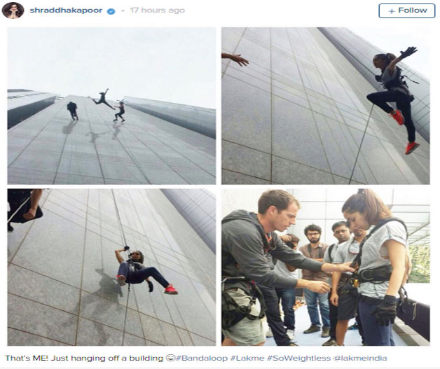 श्रद्धा ने अपने इस हैरतअंगेज कारनामे की कई तस्वीरें सोशल मीडिया पर पोस्ट की हैं। इन तस्वीरों को देख आप दांतों तले उंगलियां दबा लेंगे और उनकी हिम्मत की दाद भी देंगे। इन तस्वीरों के साथ श्रद्धा ने लिखा है, 'That’s ME! Just hanging off a building'।