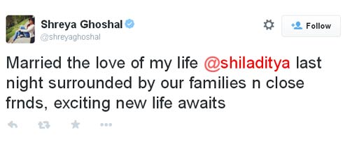 खुद श्रेया ने ट्विटर पर इसकी जानकारी दी है। सिंगर ने ट्वीट किया, 'बीती रात मैंने अपने प्यार शीलादित्य के साथ अपने परिवार और दोस्तों के बीच शादी कर ली है। नई रोमांचक जिंदगी इंतजार कर रही है।'