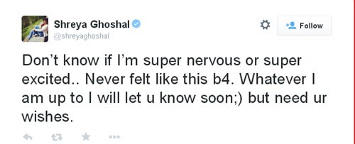 इससे पहले उन्होंने अपनी शादी के संकेत ट्विटर पर पहले ही दे दिए थे। 30 जनवरी को उन्होंने ट्वीट किया था, 'पता नहीं कि मैं बहुत नर्वस हूं या बेहद उत्साहित हूं। इससे पहले ऐसा अहसास कभी नहीं हुआ। मेरे साथ जो हो रहा है, उसके बारे में मैं आपको जल्द ही बता दूंगी। लेकिन मुझे आपकी दुआओं की जरूरत है।'