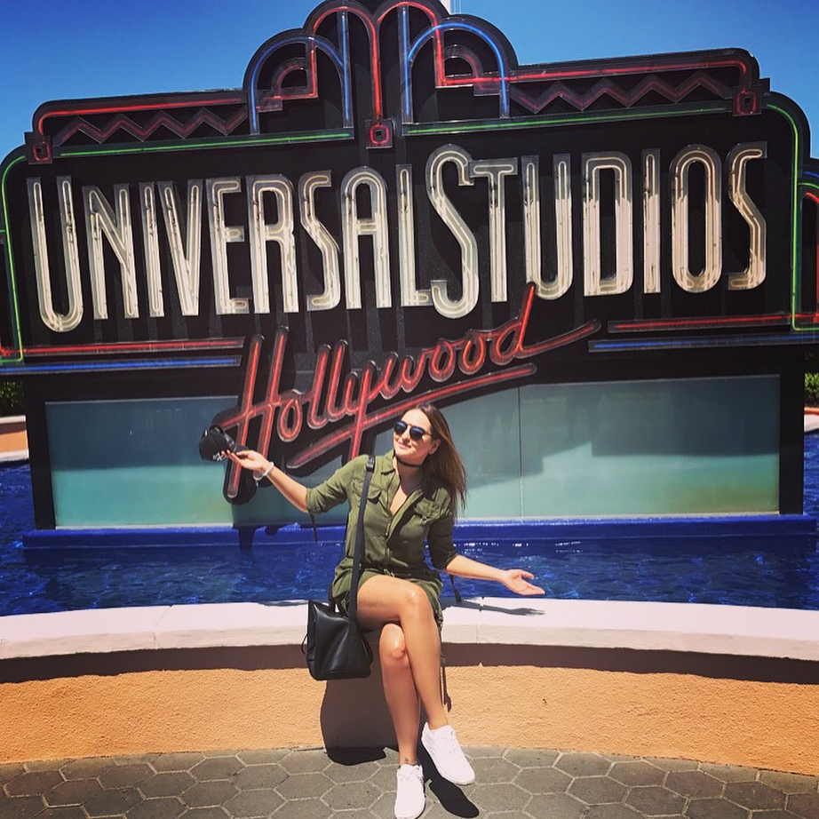 ये है लॉस एंजेल्स का हॉलीवुड यूनिवर्सल स्टूडियोज़ जिसके लोगो के आगे सोनाक्षी ओलिव ग्रीन शर्ट स्टाइल ड्रेस में तस्वीर के लिए पोज़ दे रही हैं।