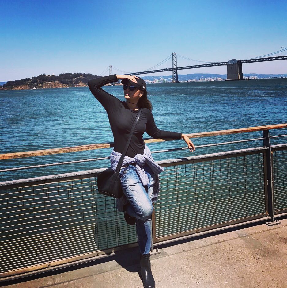 यह तस्वीर है सैनफ्रांसिस्को के बे ब्रिज की जहां सोनाक्षी ब्लैक टी-शर्ट, ब्लैक कैप और ब्लैक बूट्स के साथ डेनिम पहने शायनी Sunny-Day का मज़ा ले रही हैं।