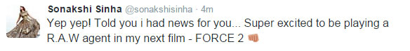 अखबार की खबर पर रिस्पॉन्स करते हुए सोनाक्षी सिन्हा ने ट्वीट किया, 'मेरे पास आपके लिए एक खबर है। अपनी अगली फिल्म 'फोर्स 2' में एक रॉ एजेंट के किरदार को निभाने को लेकर मैं बहुत उत्साहित हूं।'
