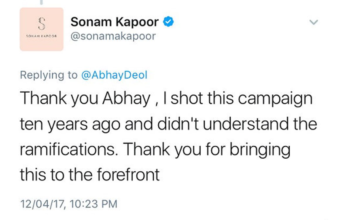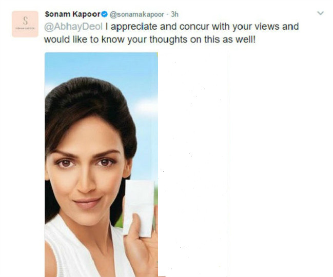 सोनम ने अपनी बात ज़रिये पेश की और लिखा, " थैंक यू अभय! मैंने यह ऐड 10 साल पहले शूट किया था और इसका असर मैं उस समय नहीं जानती थी। इस बात को आगे लाने के लिए थैंक यू!" सोनम यहीं नहीं रुकी...सोनम ने अपने दुसरे ट्वीट में अभय को आइना दिखाते हुए उनकी बहन ईशा देओल की एक ऐसी ही तस्वीर शेयर की जहां वो भी फेयरनेस क्रीम का ऐड कर रही है और लिखा, "मैं तुम्हारी सोच को अप्रिशिएट करती हूं और अब इस ऐड के बारे में भी तुम्हारी राय चाहतीं हूं।
