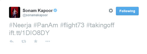 इस तस्वीर में ब्लैक कलर का एक कोट दिख रहा है जिसपर पैन एम एयरलाइंस का मार्क है और उसके नीचे लिखा है 'एन. भनोट पर्सर।' इसके तस्वीर के साथ ही एक्ट्रेस ने ट्वीट किया, 'नीरजा, पैन एम,फ्लाइट73, टेकिंग ऑफ।'