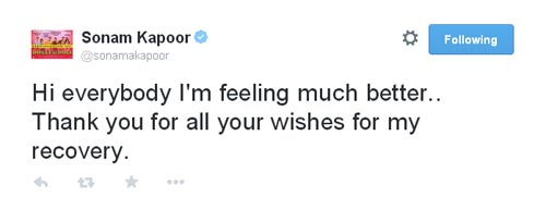 सोनम की सेहत में पहले से सुधार है लेकिन फिलहाल वो अस्पताल में ही आराम करेंगी। खुद सोनम ने ट्विटर पर इसकी जानकारी दी है। एक्ट्रेस ने ट्वीट किया, 'मैं पहले से बेहतर महसूस कर रही हूं। मेरी सेहत में सुधार के लिए आप सबकी दुआओं के लिए शुक्रिया।'