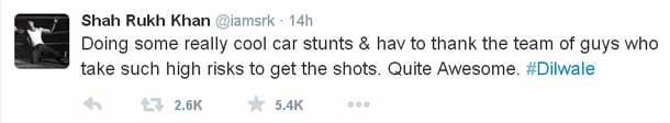 साथ ही शाहरुख ने स्टंट्स सीन्स को अच्छी तरह से शूट करने के लिए टीम का शुक्रिया अदा किया। शाहरुख ने ट्वीट किया, 'काफी कूल कार स्टंट्स कर रहा हूं और टीम को शुक्रिया कहना होगा जो शॉट्स लेने के लिए इतने जोखिम उठाते हैं। काफी गजब के हैं। दिलवाले।'