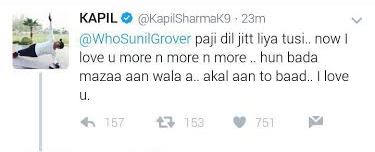 इससे पहले कपिल के पोस्ट पर पाठकों ने कुछ तीखी प्रतिक्रिया भी दी है। ज़्यादातर फैंस ने कपिल शर्मा के इस पोस्ट्स पर लिखा है कि सुनील ग्रोवर ही उनके शो की जान हैं। कुछ फैंस ने जमकर कपिल शर्मा को लताड़ भी लगायी है। सुनील ग्रोवर के इस ट्वीट पर कपिल शर्मा का जवाब भी आ गया, जैसे उन्हें अपनी भूल का अहसास हो गया है और कपिल के ट्वीट से साफ़ ज़ाहिर है कि वो सुनील को मनाने की पूरी कोशिश करने वाले हैं। कपिल ने लिखा कि- पाजी दिल जीत लिया तुस्सी! अब मैं आपको और भी ज्यादा प्यार करने वाला हूं, अक्ल आने के बाद!