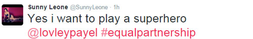 सनी लियोन के फैंस ने उनसे पूछा कि आपका ड्रीम रोल क्या है और क्या ये सुपरवुमन का कैरेक्टर तो नहीं है? इसके जवाब में सनी लियोन ने कहा कि हां, मैं सुपरहीरो बनना चाहती हूं। ये रहा उनका ट्वीट।