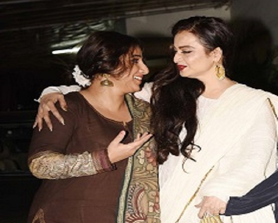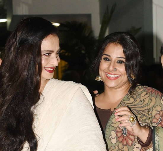 इस मौके पर रेखा और विद्या दोनों का ट्रेडिशनल अंदाज दिखा। विद्या डिजाइनर सूट तो रेखा डिजाइनर साड़ी में दिखाई दी थीं।