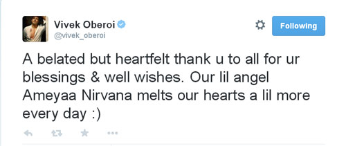 विवेक ने ट्विटर पर बताया कि उन्होंने बेटी का नाम रख दिया है। एक्टर ने ट्वीट किया, 'देर से लेकिन आपकी दुआओं के लिए सभी को दिल से शुक्रिया। हमारी नन्ही परी अमया निरवाना हर रोज हमें और ज्यादा भावुक कर देती है।'