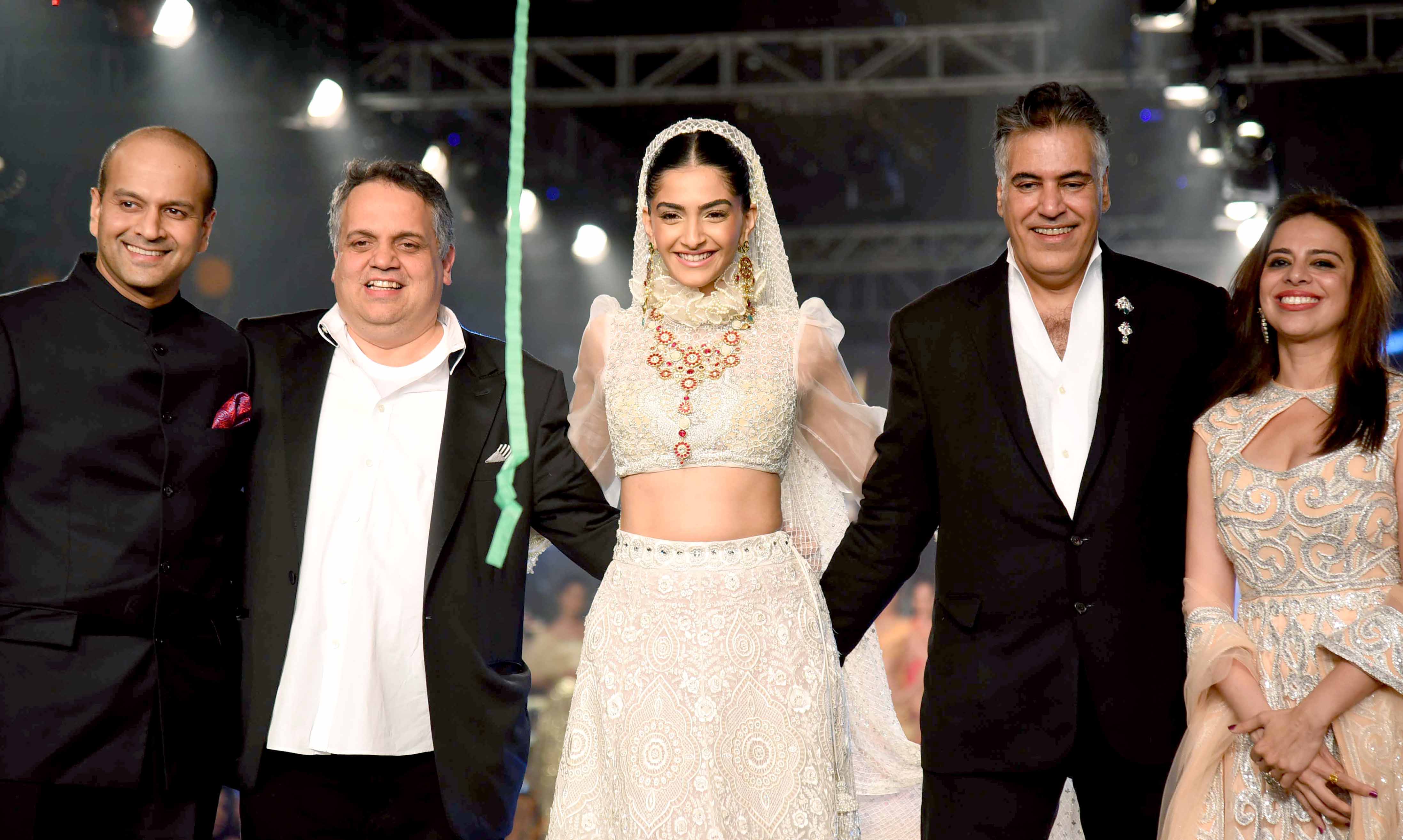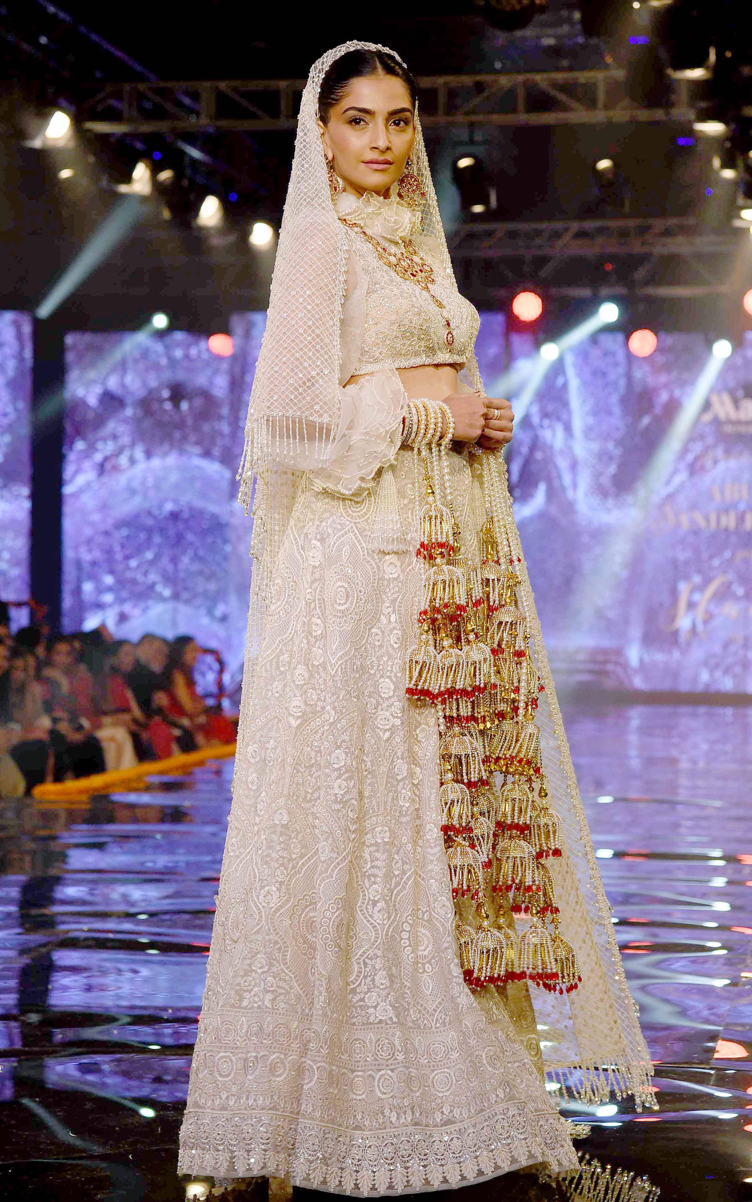 जब सोनम लम्बे कलिरों को हाथ में लिए इस ख़ूबसूरत ऑउटफिट और ज्वेलरी के साथ रैम्प पर उतरीं तो वहां मौजूद जया बच्चन, अमृता सिंह और भी कई सेलेब्स उन्हें देखते ही रह गए। सोनम लग ही रहीं थी इतनी ख़ूबसूरत और हमें यकीन है कि इन तस्वीरों को देखकर आप भी कहेंगे कि सोनम के दुल्हे राजा कहां हैं?