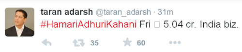 व्यापार विश्लेषक तरण आदर्श ने ट्विटर पर फिल्म के कलेक्शन की जानकारी दी। उन्होंने ट्वीट किया, 'हमारी अधूरी कहानी ने शुक्रवार को भारत में 5.04 करोड़ का बिजनेस किया।'