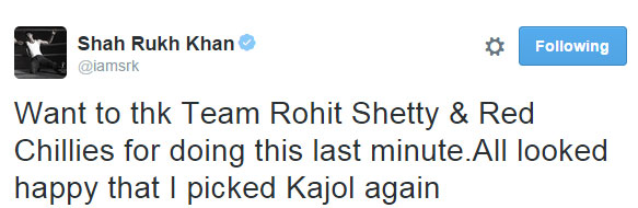 इस नए पोस्टर के साथ शाहरुख ने ट्वीट कर कहा कि लास्ट मिनट पर ये सब करने के लिए वो रोहित शेट्टी और रेड चिलीज का शुक्रिया अदा करना चाहते हैं। ये रहा उनका वो ट्वीट।