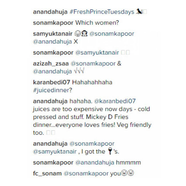 वहीं ये चैट और भी दिलचस्प हो गई जब इसमें सोनम की बेस्ट फ्रेंड समयुक्ता नायर कूद पड़ीं। उन्होंने सोनम और आनंद को टैग करते हुए कुछ ऐसा लिखा जिसका इशारा ये था कि आनंद को सोनम को डिनर डेट पर ले जाना चाहिए। इस पर आनंद ने सोनम को वेजेटेरियन डेट पर ले जाने की दिलचस्पी दिखाई, क्योंकि सोनम ने चार-पांच साल पहले ही नॉन-वेजेटेरियन खाना बंद कर दिया था।