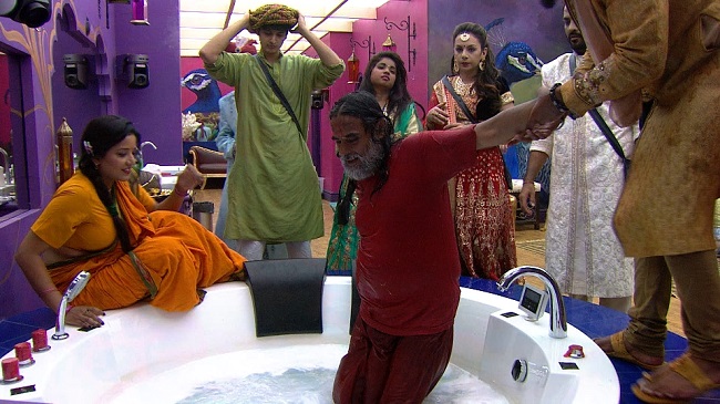 सेलिब्रिटीज़ को सीक्रेट टास्क दिया गया है और वे एक-एक करके इंडियावालों से उन्हें बिना बताये वह टास्क पूरा कर रहे हैं। इस टास्क में सबसे अधिक एक्टिव कोई नजर आ रही हैं तो वो हैं मोनालिसा। मोनालिसा ने पिछले एपिसोड में मनु को किस करने वाला टास्क पूरा किया है और अब बारी स्वामी जी की है। आज के एपिसोड में दर्शक देखेंगे कि सेलिब्रटीज़ बहाने से स्वामी जी को शाही स्नान के लिए ले जायेंगे। स्वामी जी भी सेवकों के झांसे में आ जाते हैं। स्नान करने के बावजूद वह शाही स्नान के लिए सेलिब्रटीज़ की तरफ से मोनालिसा और लोपा के साथ जाते हैं। जहां दोनों लड़कियां उन्हें स्वीमिंग पूल में ढकेल देती हैं, जो कि उनका टास्क भी था।