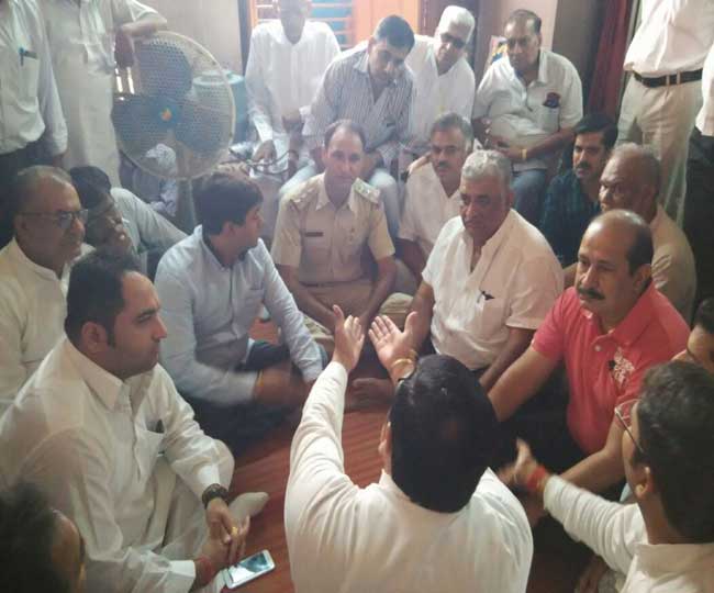 गिरफ्तारी के विरोध में बैठक करते दुकानदार।