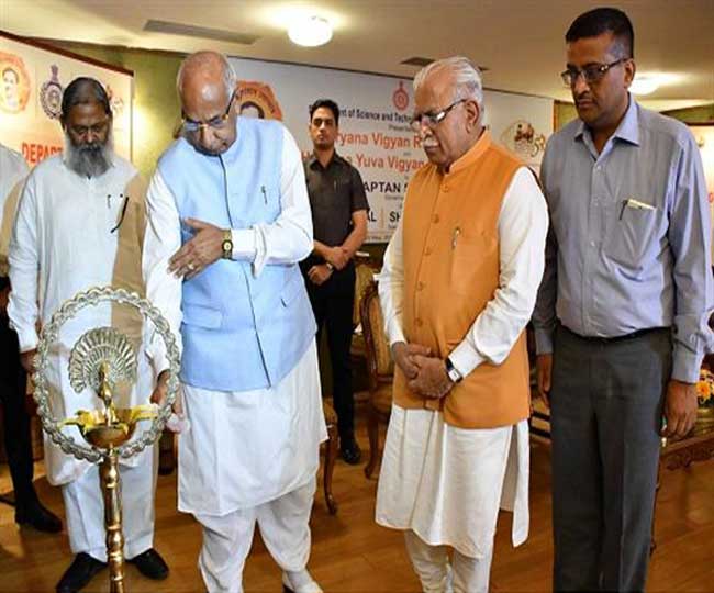 एक कार्यक्रम में राज्‍यपाल प्रो. कप्‍तान सिंह साेलंकी, सीएम मनोहरलाल के साथ अशोक खेमका।