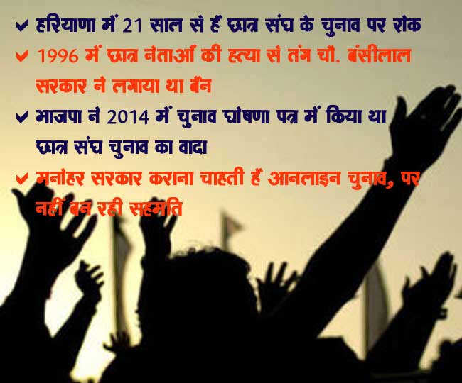 प्रदेश में पिछले 21 साल से छात्र संघ के चुनाव पर रोक लगी हुई है। इस पर रोक लगाए जाने के समय हरियाणा में हविपा-भाजपा गठबंधन की सरकार थी और मुख्यमंत्री चौधरी बंसीलाल थे। अब फिर छात्र संघ के चुनाव आरंभ करने की प्रक्रिया शुरू हुई है, लेकिन चुनाव कराने के प्रारूप पर सरकार और छात्र संगठन आमने सामने आ गए हैैं। सरकार कालेजों में खून-खराबे की आशंका जताते हुए यह चुनाव आनलाइन चुनाव कराने के हक में है। दूसरी अोर, छात्र संगठन इस प्रक्रिया को स्वीकार करे को तैयार नहीं हैं।