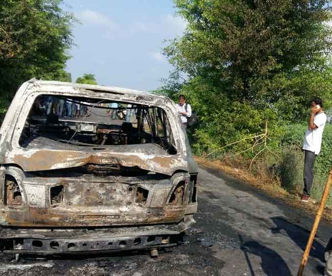 सिरसा में डेरा प्रेमियों द्वारा जलाया गया वाहन।
