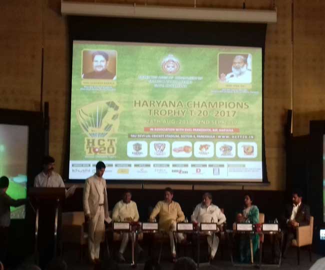 पंचकूला में टी-20 क्रिकेट चैंपियन ट्रॉफी के अनावरण समरोह का नजारा।