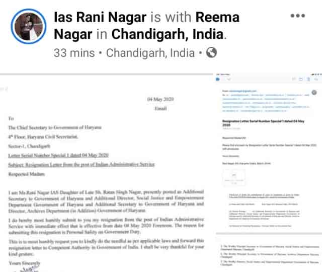 हरियाणा कैडर की IAS अधिकारी रानी नागर ने अपने पद से इस्तीफा दे दिया है। उन्होंने इसकी प्रति अपने Facebook account पर भी डाली है।