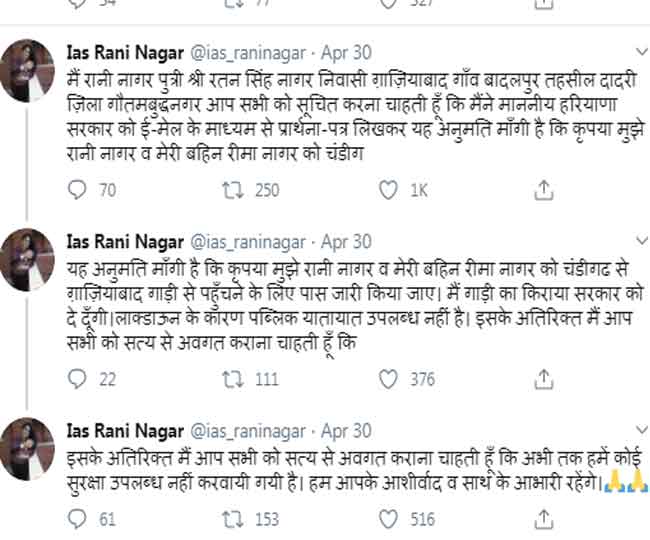 रानी ने अपने और अपनी बहन को लॉकडाउन के दौरान ही गाजियाबाद जाने को सरकारी वाहन सहित अनुमति मांगी है। इसके अलावा उन्होंने इस बात पर भी नाराजगी जताई है कि उन्हेंं अभी तक चंडीगढ़ प्रशासन सहित हरियाणा सरकार ने सुरक्षा मुहैया नहीं कराई है। रानी ने सोशल मीडिया पर एक बार फिर दोहराया है कि उसे अपनी जान का खतरा है, इसलिए वह IAS की नौकरी से त्यागपत्र देना चाहती है। फिलहाल वह अपने घर जाकर परिवार से बात करेगी।