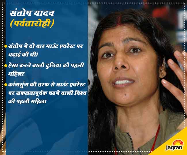 रेवाड़ी में जन्मी संतोष यादव दुनिया की पहली महिला हैं, जिन्होंने दो बार माउंट एवरेस्ट पर चढ़ाई की। इसके अलावा वह कांगसुंग की तरफ से माउंट एवरेस्ट पर विजय हासिल करनेवाली विश्व की पहली महिला भी बनीं। 2000 में उन्हें पद्मश्री से सम्मानित किया गया और अब वह इंडो-तिब्बती सीमा पुलिस में कार्यरत हैं। इनके अलावा कैथल जिले की ममता सौदा ने भी दुनिया में हरियाणा का नाम रोशन किया है। इसी तरह हिसार की बेटी अनीता कुंडू माउंट एवरेस्ट को नेपाल और चीन दोनों तरफ से फतह कर चुकी हैं।
