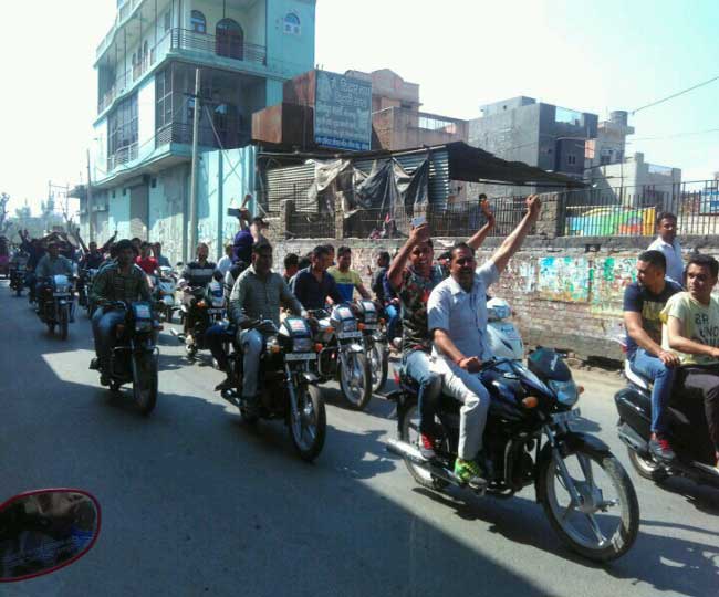 जींद में नारेबाजी करते बाइक सवार युवक।