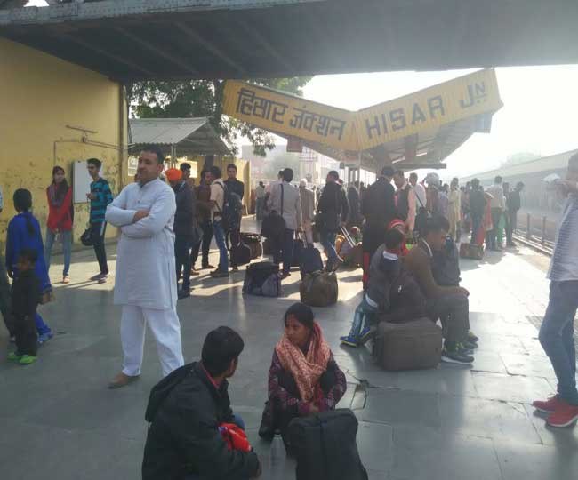 हिसार में बस सेवाएं बंद होने से रेलवे स्टेशन पर लगी यात्रियों की भीड़।