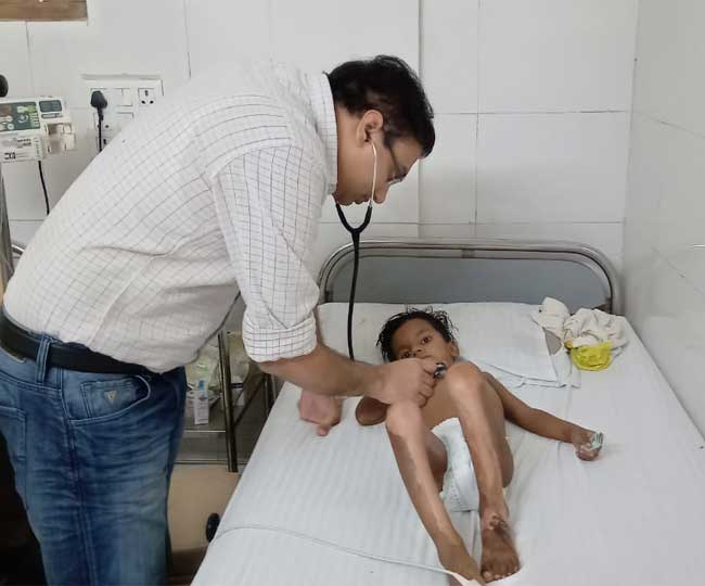 अस्पताल में भर्ती बच्चे की जांच करते डॉक्टर।