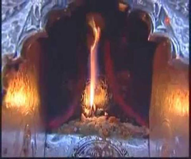 बताया जाता है कि देवी सती की यहां जीभ गिरी थी। इस मंदिर में अग्नि की लपटें एक पर्वत से निकलती हैं। अकबर को अपने शासन के समय जब इस मंदिर के बारे में पता चला था तो उसने आग की लपेटों की ऊपर एक नहर बनाकर पानी छोड़ दिया था, फिर भी यह लपेटें नहीं बुझी थी। उसके बाद अकबर ने इन्हें लोहे के बड़े ढक्कन (तवा) से बुझाने का भी प्रयास किया था लेकिन यह उसे फाड़कर भी बाहर आ गई थी। उसके बाद अकबर यहां नंगे पांव आया था और मां से माफी मांगते हुए यहां सोने का छत्र अर्पित किया था।