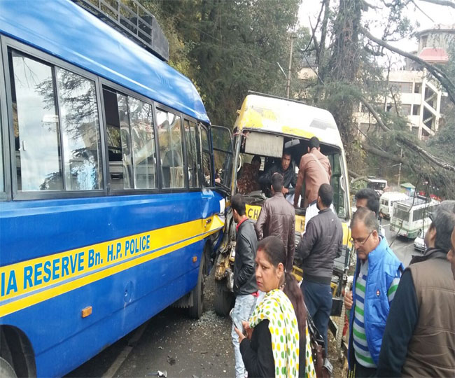 शिमला, जेएनएन। शिमला के अति व्यस्त रहने वाले संजौली में 2 बसें आपस में टकरा गई हैं। ये टक्कर एक स्कूल बस और पुलिस की बस के बीच हुई है। पुलिस की बस एचपी63-4615 ने स्कूल बस एचपी 51 बी- 7504 को जोरदार टक्कर मार दी। जिससे स्कूल बस ड्राइवर को हल्की चोटें आई है। उसे इलाज के लिए आइजीएमसी ले जाया गया है।
