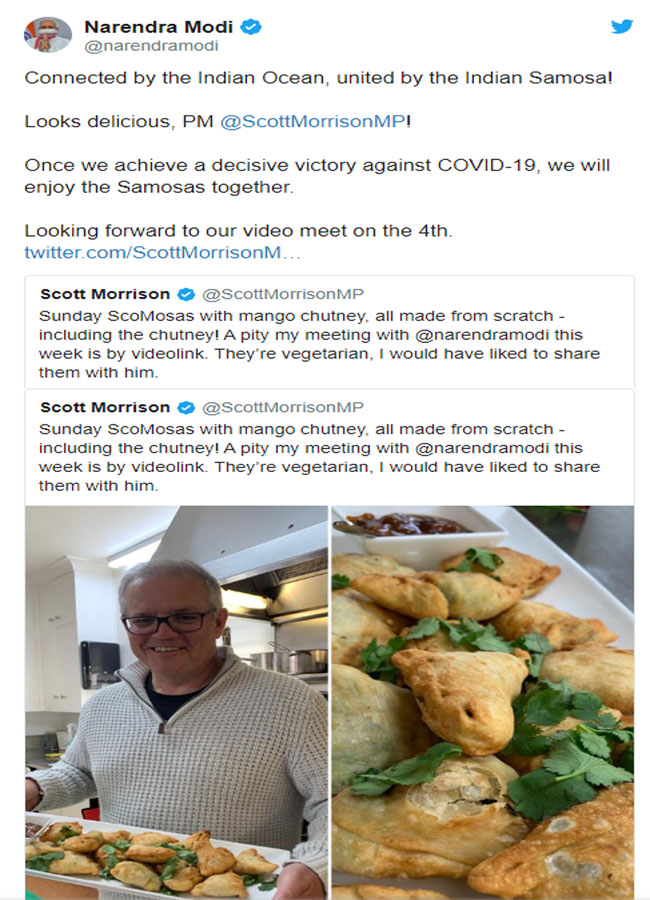 मॉरिसन के इस ट्वीट पर प्रतिक्रिया देते हुए पीएम मोदी ने कहा था कि दोनों देश हिंद महासागर से जुड़े है और भारतीय समोसे से एकजुट हैं। पीएम मोदी ने अपने ट्वीट में ये भी लिखा था कि समोसे काफी स्वादिष्ट दिख रहे हैं प्रधानमंत्री स्कॉट मॉरिसन। जब कोविड-19 के खिलाफ हम निर्णायक जीत हासिल कर लेंगे तो हम एक साथ मिलकर समोसे का आनंद उठाएंगे। इसी दौरान दोनों नेताओं के बीच चार जून को होने वाले वर्चुअल समिट की जानकारी सार्वजनिक हुई थी। दोनों नेताओं के इन ट्वीट को लोगों ने काफी सराहा था।