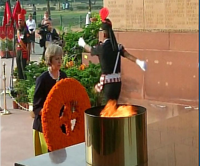 ब्रिटेन की प्रधानमंत्री टेरीजा मे ने दिल्ली स्थित अमर जवान ज्योति पर पहुंच कर जवानों को श्रद्दांजलि दी।