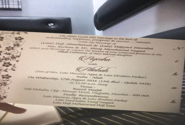 परिवार के नजदीकी सूत्रों के मुताबिक, निकाह की रस्में नागपाड़ा की रसूल मस्जिद में बुधवार सुबह 11 बजे अदा की जाएंगी। लेकिन, शादी का मुख्य आकर्षण होगा रिसेप्शन या दावत-ए-वलीमा। इसका आयोजन बुधवार को ही रात नौ बजे मुंबई के जुहू इलाके में स्थित ट्यूलिप स्टार होटल के हार्बर हॉल में किया जाएगा। इस हॉल की क्षमता 800 लोगों की है। अली शाह की शादी मुंबई के ही एक व्यवसायी शिराज अली मोहम्मद नगानी की बेटी आयशा से हो रही है। शादी के आमंत्रण पत्र की एक प्रति 'मिड-डे' के पास भी है।