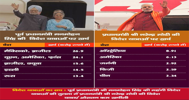 पूर्व प्रधानमंत्री मनमोहन सिंह की महंगी विदेश यात्राओं की तुलना में प्रधानमंत्री नरेंद्र मोदी की यात्राएं औसतन कम खर्चीली है। भारतीय जनता पार्टी (भाजपा) ने शनिवार को ट्विट किया है। जिसके मुताबिक, मनमोहन की विदेश यात्राएं ज्यादा खर्चीली है।